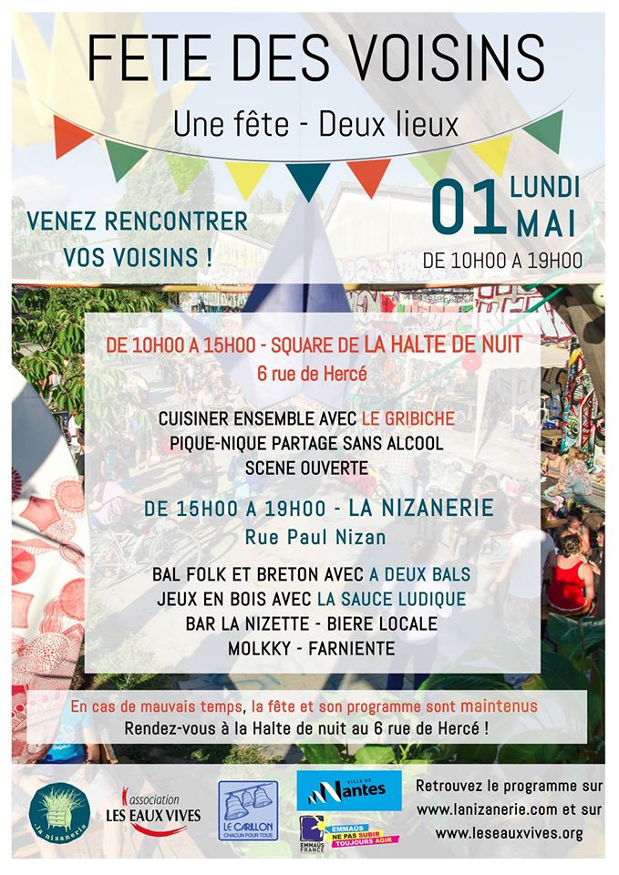 Lundi 1er Mai c’est l’occasion de se retrouver entre habitants du quartier. Entre 10h et 19h la Nizanerie, la Halte de nuit et le Carillon vous proposent de se retrouver pour passer du temps ensemble à discuter, rigoler, festoyer et fêter le printemps.